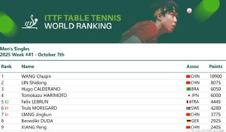 The International Table Tennis Federation (ITTF) has released its latest world rankings for Week 41 of 2025, showcasing historic milestones for two of China’s top players. In the men’s singles division, Wang Chuqin achieved a remarkable feat by surpassing 10,000 points, solidifying his status as a dominant force in the sport.