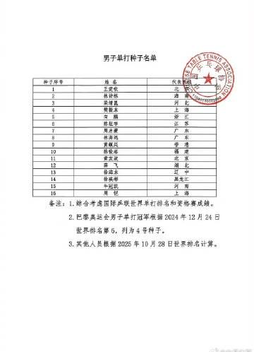 The Chinese Table Tennis Association has officially released the seedings and participant list for the upcoming 15th National Games table tennis finals, revealing an exciting lineup of China’s top paddlers ready to compete for national glory.